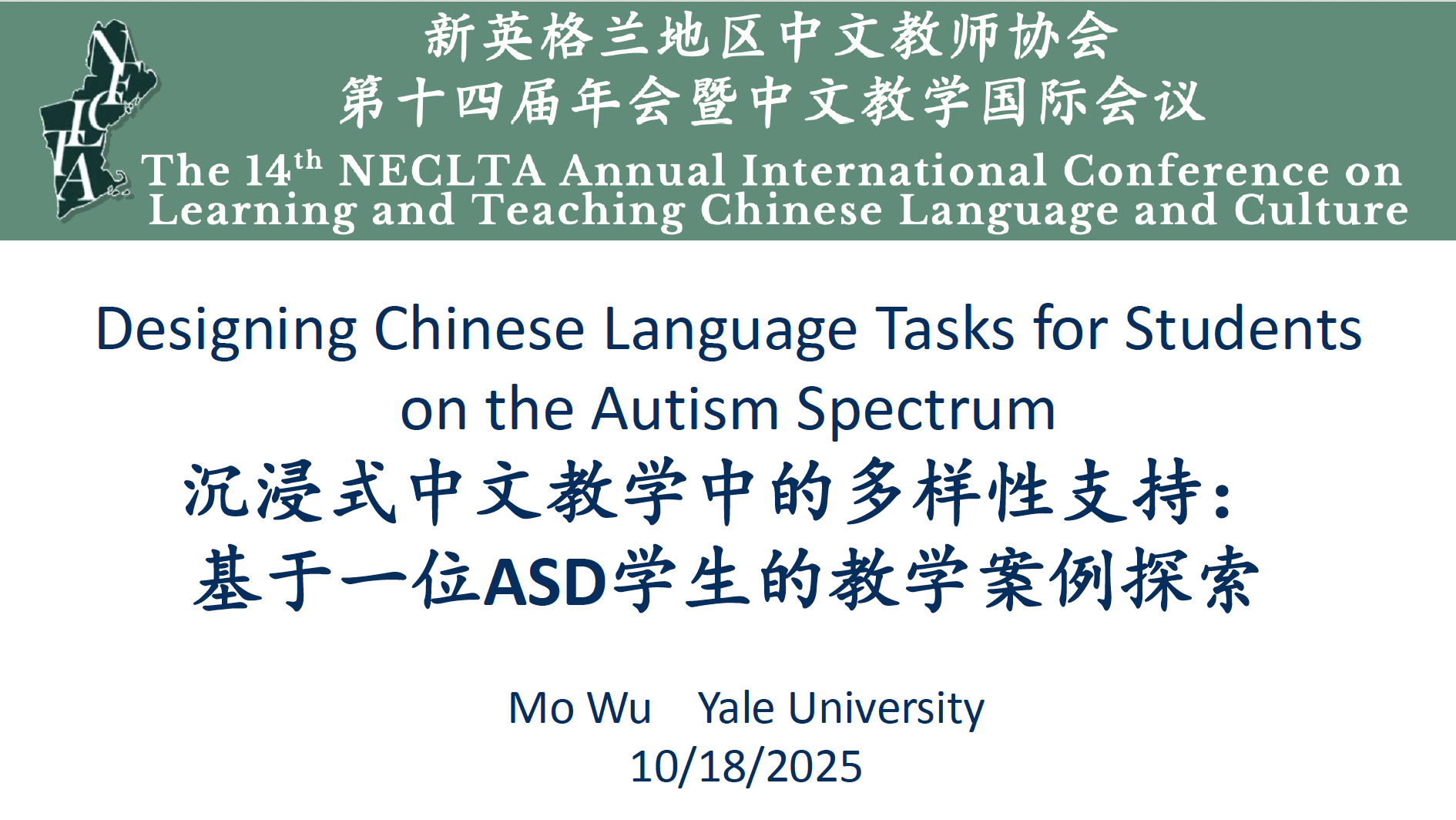 Designing Chinese Language Tasks for Students on the Autism Spectrum 沉浸式中文教学中的多样性支持: 基于一位ASD学生的教学案例探索 (2025 NECLTA)